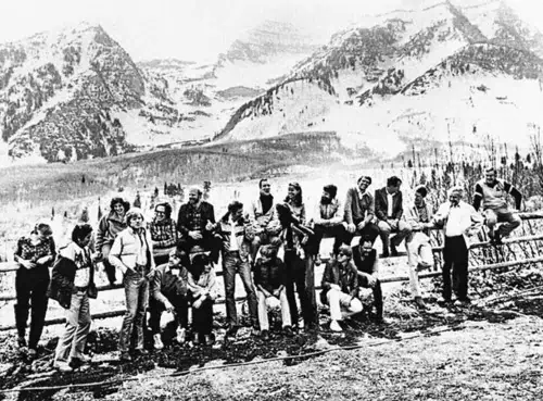 The first planning meeting for the embryonic Sundance Institute and arts center, near Redford’s home in Provo Canyon. Redford is fourth from left. (Photo by Vindedu, 1980)
