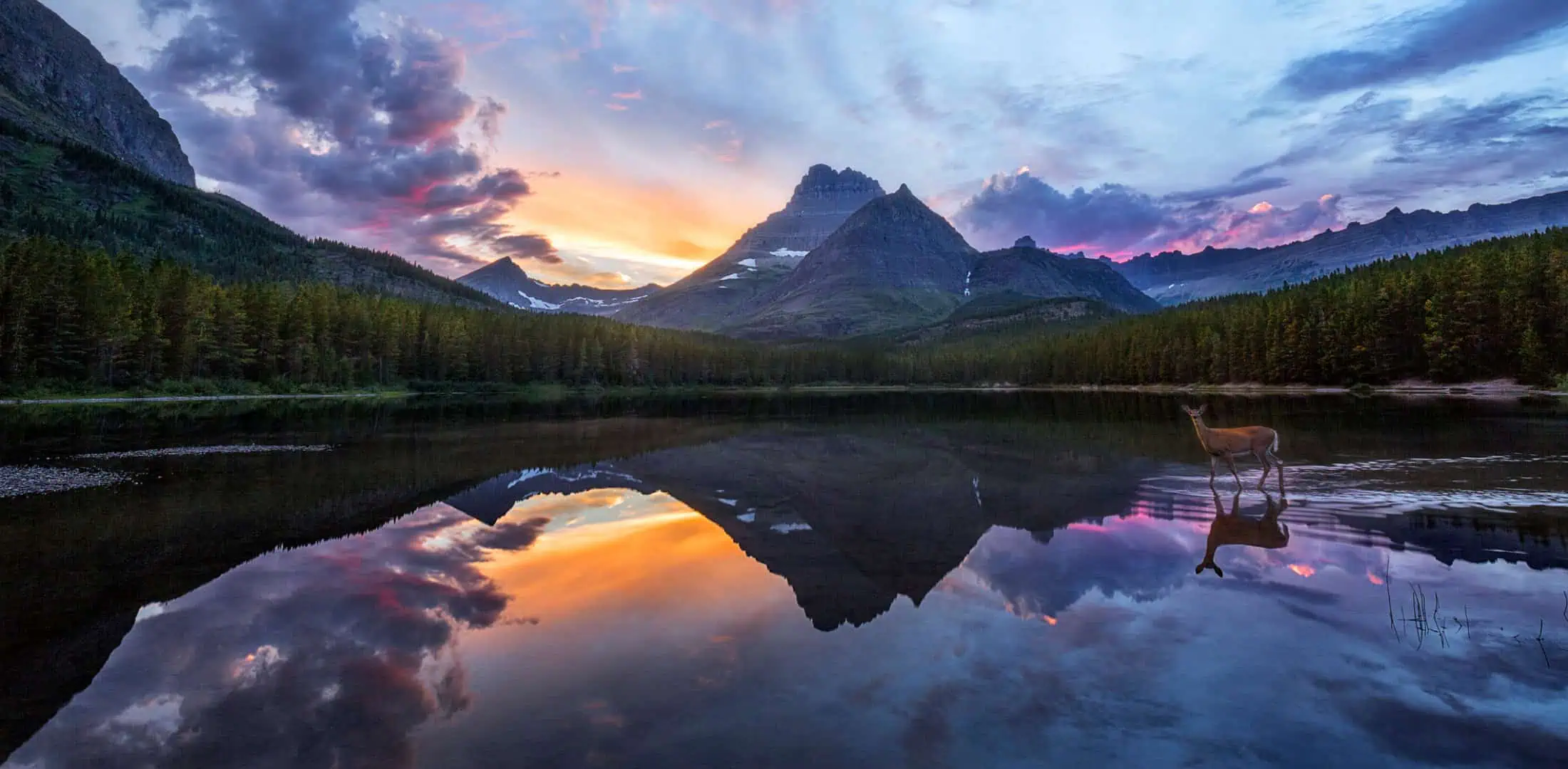 A mule deer wanders out into the shallows of a small lake in Glacier National Park, Montana. (Photo by Jon Farmer-iStock)