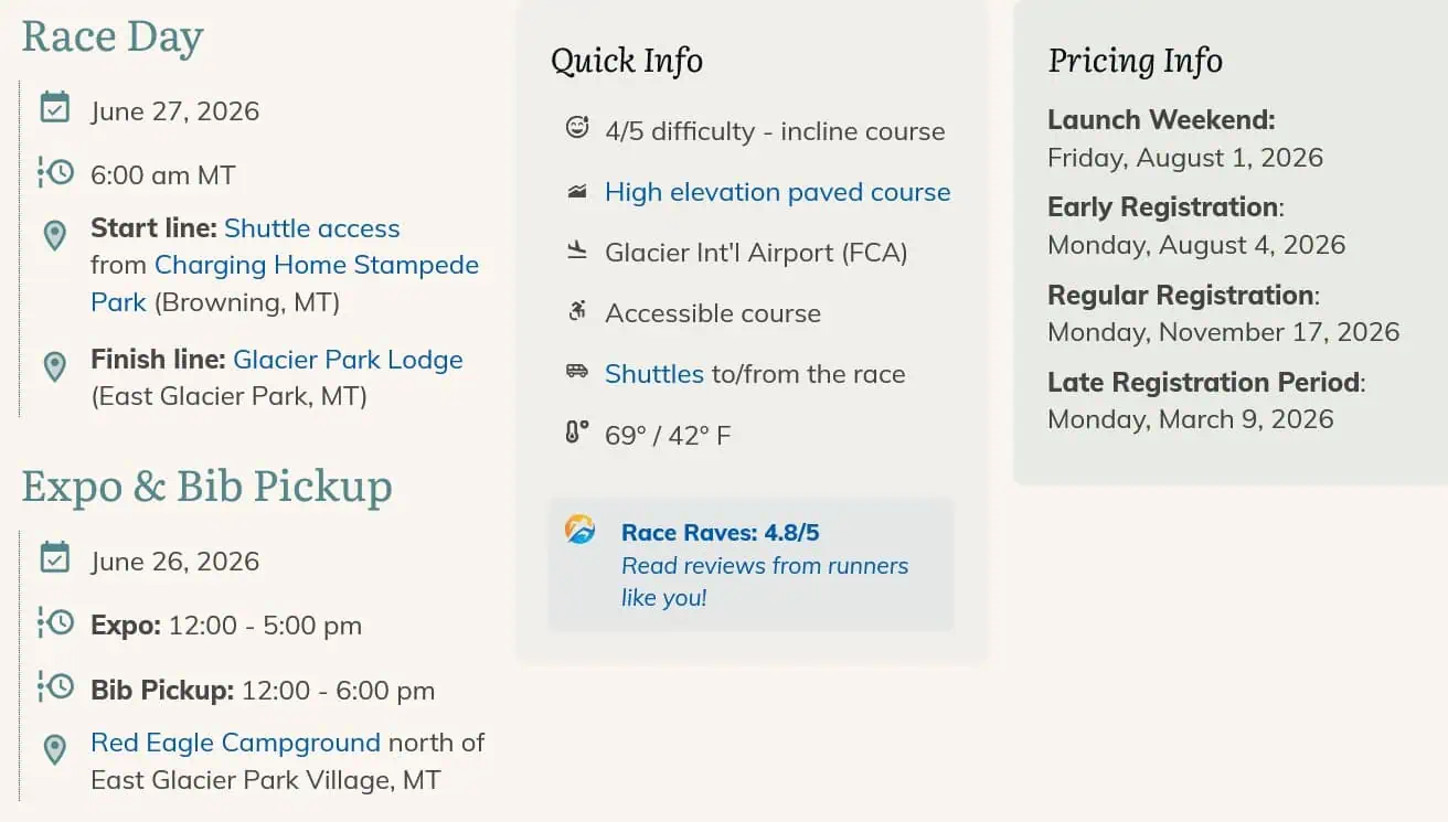 Organization, according to participant reviews, is strong: well-placed aid stations, smooth shuttle logistics to the start, and thoughtful touches like partnering with the Blackfeet Tribe (since the course begins on reservation land) and giving some of the registration proceeds back to the community. You can even reserve a campsite in the Vacation Races Campground (located at Red Eagle Campground on the Blackfeet Reservation, right by Lower Two Medicine Lake) when you register for the race.